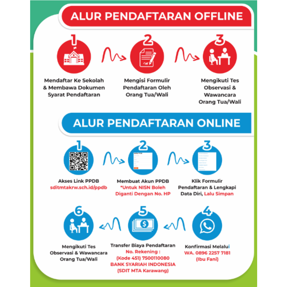 5. Setelah itu melakukan pembayaran pendaftaran Rp. 320.000,-. Bisa datang langsung ke sekolah, dengan sebelumnya menghubungi no Whatsapp, atau Pembayaran melalui Transfer: No Rekening : Kode Bank (451) 7500110080 Bank Syariah Indonesia a.n. SDIT MTA Karawang. Setelah transfer, konfirmasikan ke no 081510040101(Admin Sekolah) dengan format: Tanggal, Nama Anak, Jumlah, Peruntukan